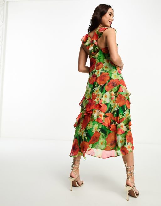 Hope Ivy frill sleeve midaxi dress in green and red floral Very well made.