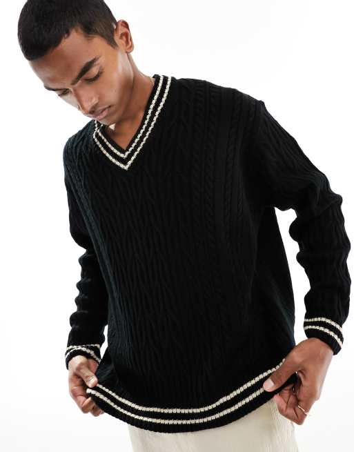 ASOS DESIGN oversized knitted v neck cricket jumper in black Very well made.