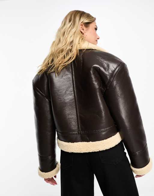 Pull Bear faux fur trim cropped aviator coat in dark brown Very well made.