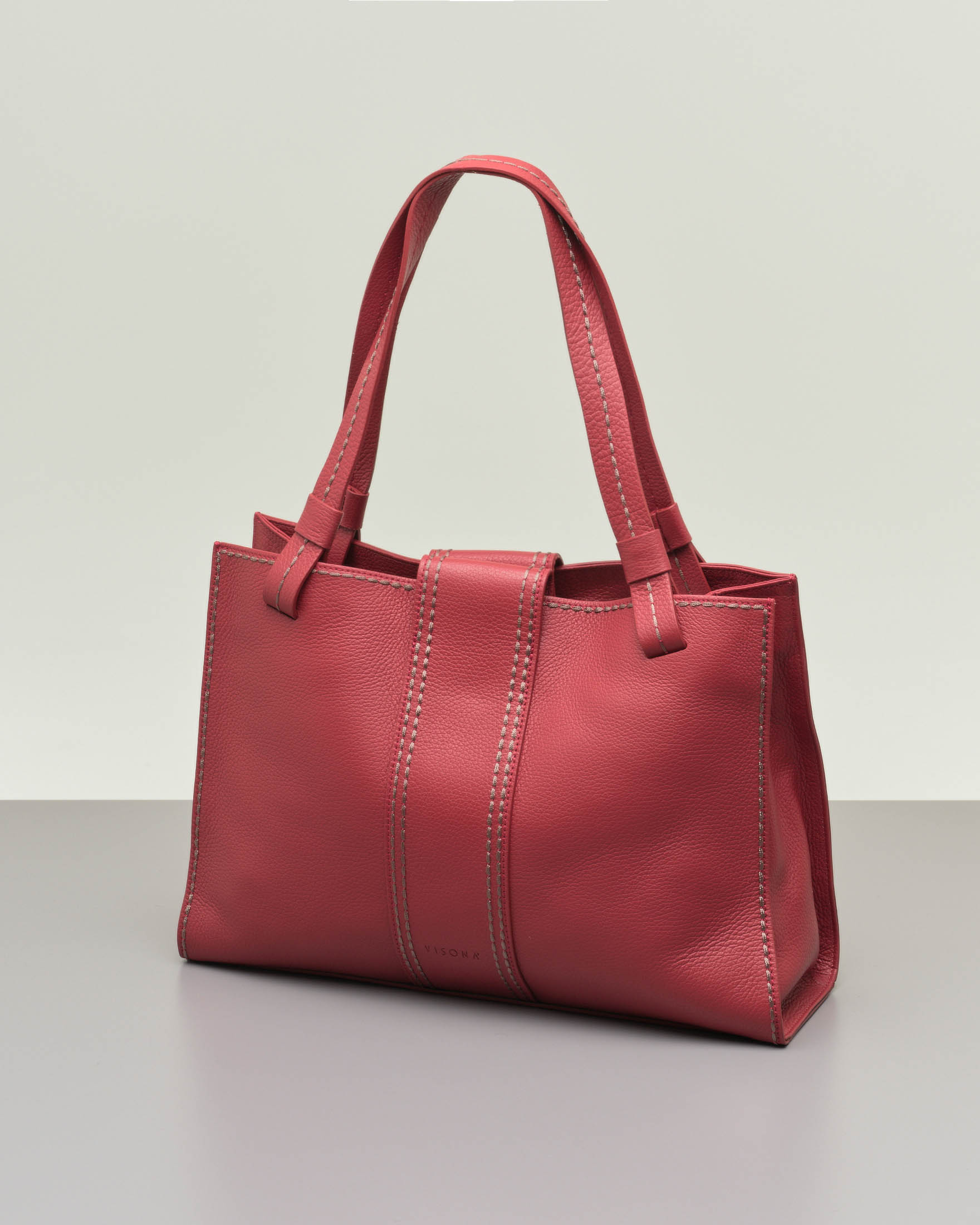 Shopping bag rossa in pelle martellata con impunture a contrasto e Very well made.