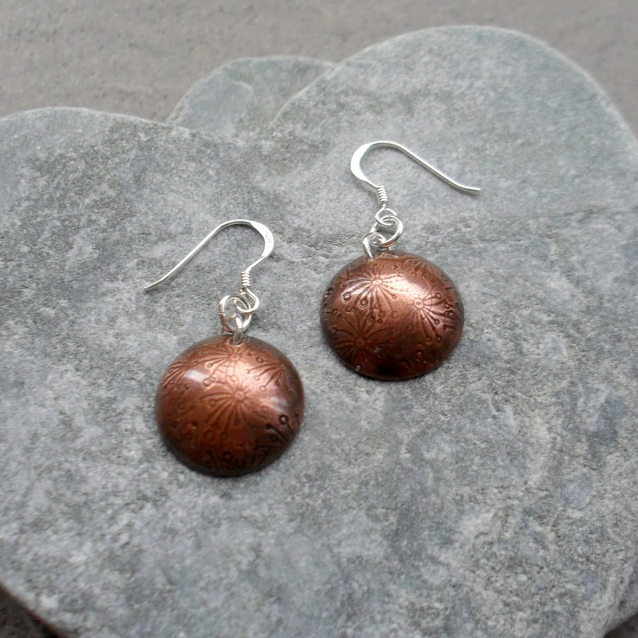 Domed Disc Shaped Copper Earrings Dandelion Detail Sterling Silver Ear Wires Very well made.
